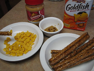 Hey good idea Mary! I have potatoes and skewers here. But my boys are drooling over your goldfish, but I am not going out in the rain with a baby.